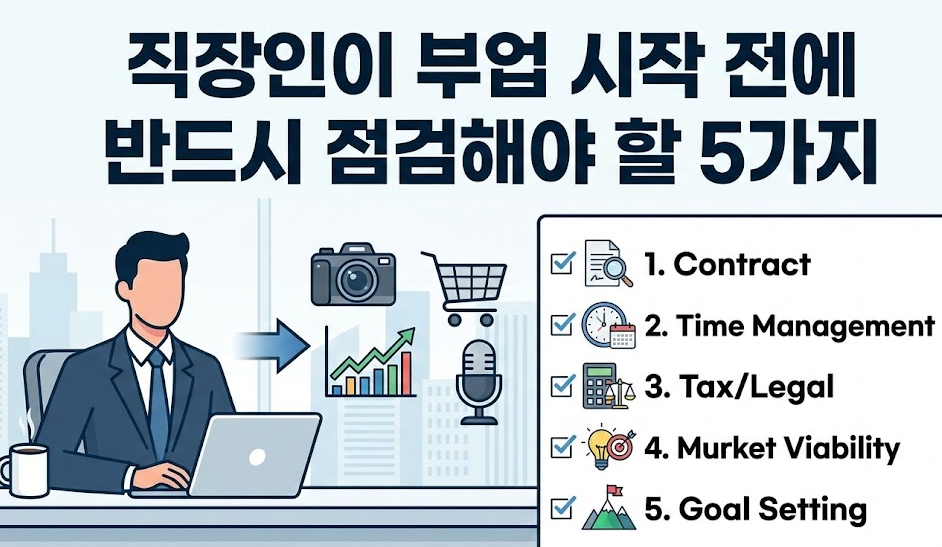 하지만 현실은 생각보다 냉정합니다. 준비 없이 시작한 부업은 3개월을 넘기기 어렵고, 수익이 나기 전에 포기하는 경우가 대부분입니다. 부업은 ‘의욕’이 아니라 ‘구조’와 ‘점검’에서 승부가 갈립니다. 지금부터 직장인이 부업을 시작하기 전에 반드시 확인해야 할 5가지 핵심 요소를 정리해보겠습니다.